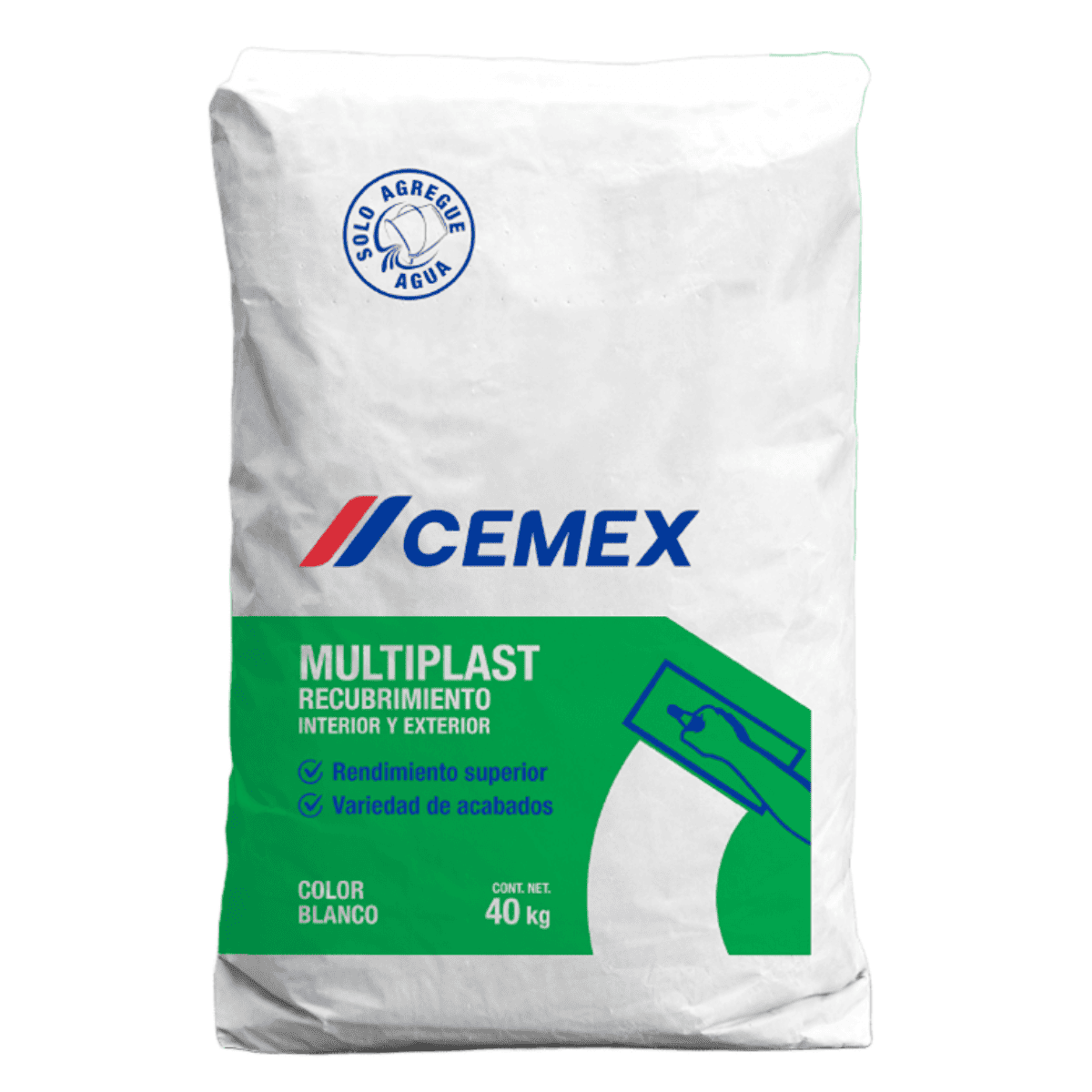 Cemex Multiplast es el material ideal para darle un acabado superior a  todos tus proyectos. Su fórmula a base de cemento blanco de calidad  Cemex, agregados seleccionados y aditivos especiales, forma una pasta  versátil y maleable al mezclarse con agua. Cemex Multiplast es un  recubrimiento perfecto para lograr todo tipo de acabados, desde lisos  hasta texturizados, y puede aplicarse directa y cómodamente en blocks o  concreto, evitando procesos extra de afine. Encuéntralo en su  presentación de 40 kilos.